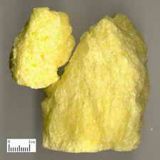 形态:斜方晶系。晶体的锥面发达,偶尔呈厚板状。常见者为致密块状、钟乳状、被膜状、土状等。颜色有黄、浅黄、淡绿黄、灰黄、褐色和黑色等。条痕白色至浅黄色。晶面具金刚光泽,断口呈脂肪光泽。半透明。解理不完全,断口呈贝壳状或参差状。硬度1~2。比重2.05~2.08。性脆。易碎。用手握紧置于耳旁,可闻轻微的爆裂声。体轻。有特异的臭气。味淡。